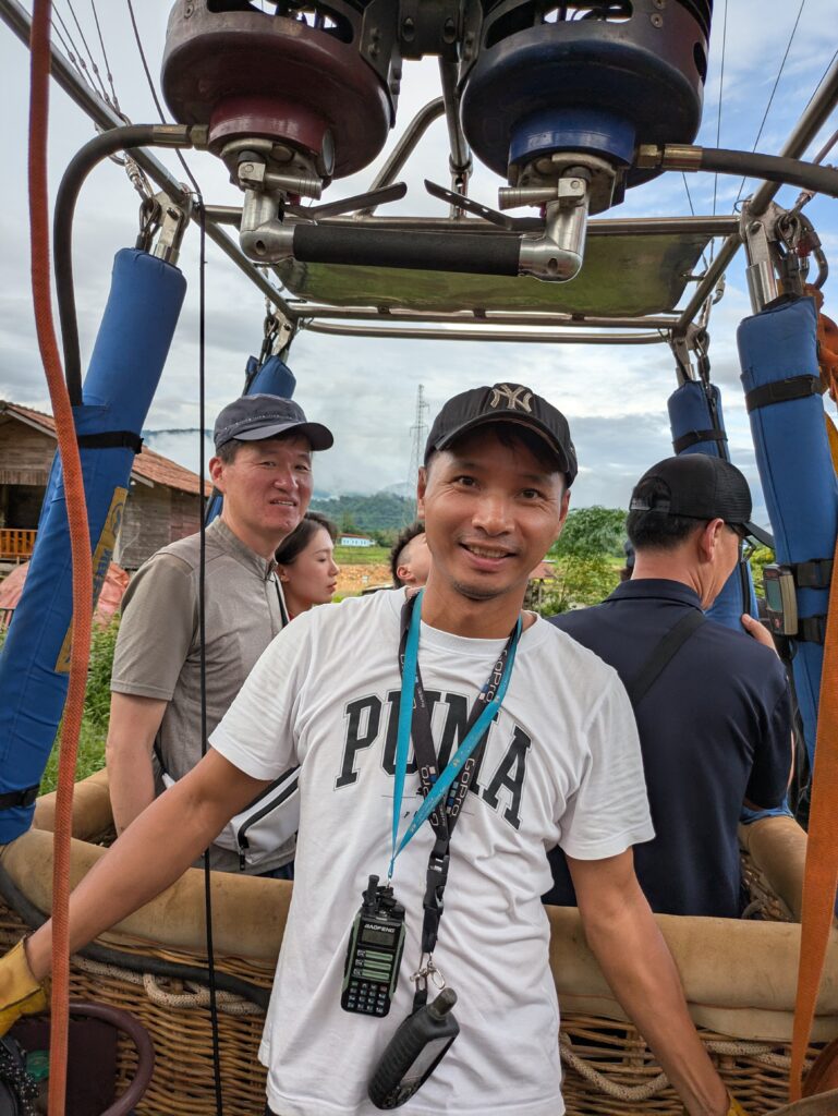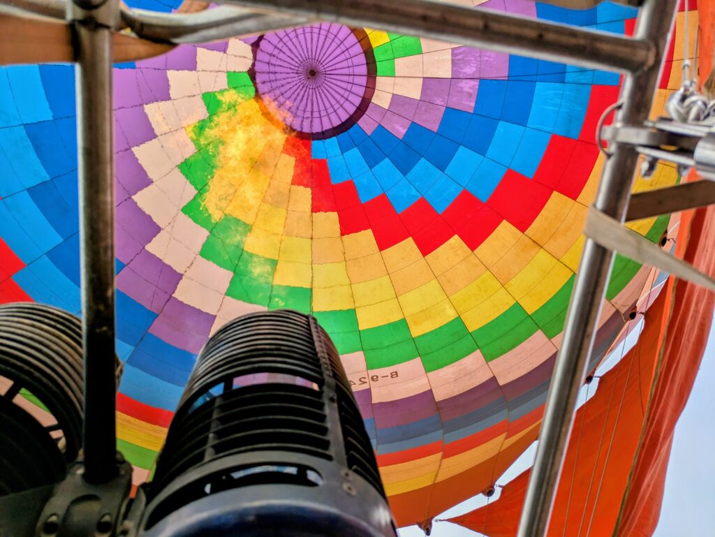 We went back to our hotel and I blogged some. Jeff went back out to deal with the card. It poured while he was out. I was hoping he was inside. At 1600 he returned, it stopped raining, and then he got a text saying the balloon ride was a go. We went down, walked the few feet to where we booked – paid, and were picked up by a rideshare truck. We were first on. The truck stopped at two more places, making our group equal ten people. We then went to the balloon site… right behind our hotel, literally!🤯 We watched the balloon laid out, and inflated – it was the pretty rainbow one! YIPEE – skippy!! The basket was attached, and the ten of us loaded up and started ascending!!