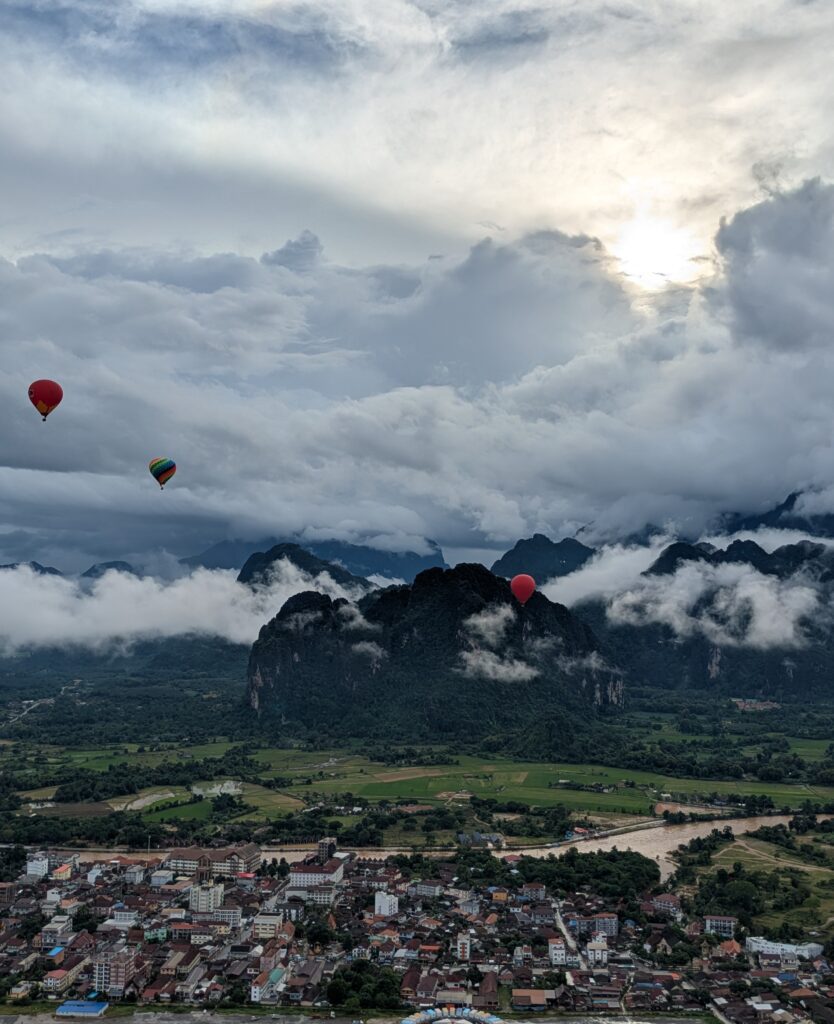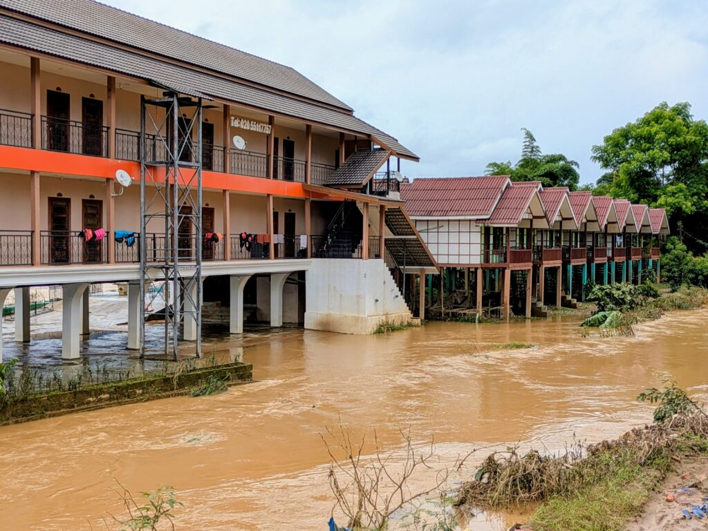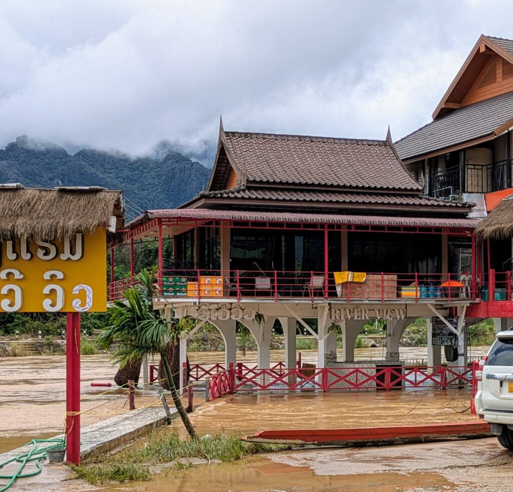 We returned to our room and I blogged as Jeff read. Then we talked with Jeff’s sister and her husband. We had gone up onto the roof and had better reception. There were a few more paramotors out and the sun tried to come out as well. As we left we walked about and it started raining. So we went for lunch. We stopped at Luang Prabang Restaurant and Bakery – we are still in Vang Vieng.🤣 I had an iced sweet orange latte coffee, and Fish & Chips. Jeff had a French-bread Pizza with ham, and a BeerLao. It cost us 419,000- Jeff gave 430,000 LAK, which is a penny over 20 bucks. The portions were huge and we had way too much food! After we finished we went out to explore. We went over to see the river in this town. It is called the Nam Song River. It seems quite swollen and full. In fact a hotel called River View… well now, should be called River Front or just The River as it was in the river! There is a temporary “bridgeway” to walk to it… Anyway, we were looking at it and Jeff went to take pictures crossing the “bridge,” when four of five guys with luggage came down. This was their hotel and they were in disbelief, to say in the least. It was funny, but only because I’m not staying here.