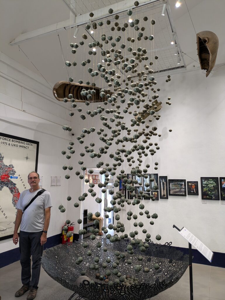 Our next destination had much needed AC, but it was a somber place – The COPE Center and Museum. It is an organization made to “help people with mobility-related disabilities move on by supporting access to physical rehab services…” The COPE museum went into the different bombs dropped on Laos from the American ‘Invaders’ during the IndoChina War. Also how the Laos people find the Unexploded Ordinances (UXO) by accident or from searching for scrap metal to recycle and some become injured. As I write this I saw on their website that ⅓ of prosthetic/orthotic devices are for UXO survivors, ⅓ are due to traffic accidents, and the last ⅓ are congenital disabilities/other accidents. Some exhibits show the Laos people repurposing shells for boats, tools, or home bowls, and even for art work. There were also exhibits on the various ortho devices to replace legs or arms that the center has used in the past. The museum was somber but also hopeful. As we left, we gave a small donation in a donation box, as there was not an entrance fee.