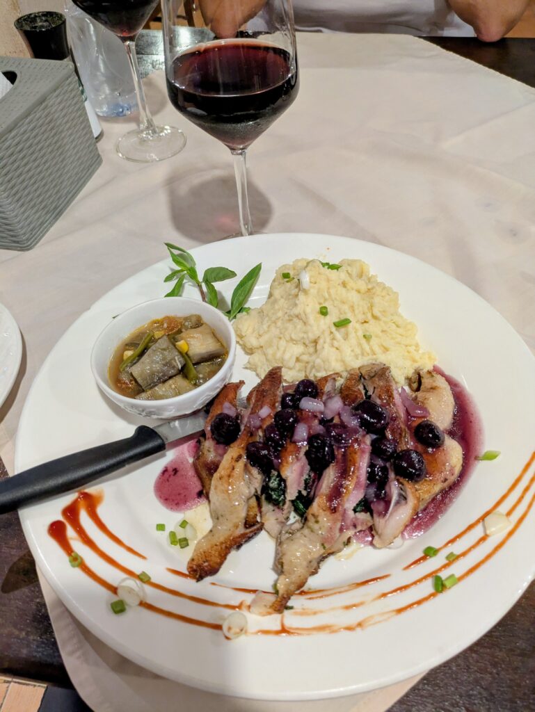 For supper we decided to go to another place for more duck. We went back out at 1800, walking a short distance to Le Vendome 2 Restaurant. It’s a French restaurant, but the decor inside is mostly of Bullfighting paintings… Huh? I think of Spain when I think of bullfights.🤔 Anyway, we did better ordering. We basically ordered a three course dinner for one person: a soup, appetiser, and entree. The soup was Chicken Soup with Paris Mushrooms, so creamy and good. Next was the appetiser- a Gratin of Vegetable. It was a mix of carrots, long beans, baby corn spheres, and onion in a Bechamel sauce, Oh la la! Last was the lovely Duck Filet stuffed with Spinach and smoked Bacon with a Forest-mixed Berry red sauce. This duck was juicy and moist with that great sauce topping and a side of mashed potatoes. It was super fine.😋 We had a carafe of house red wine and thoroughly enjoyed our meal. This duck was hands down better than last night… we may come here again before we leave. It reminded me of a great restaurant we used to go to in Kansas City! Our whole meal cost 509,000 LAK – with a 20,000 tip because our service was outstanding. That comes to only $23.91! Not at all comparable to the price of the restaurant in KC!!! Great day in Laos!