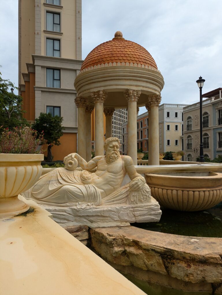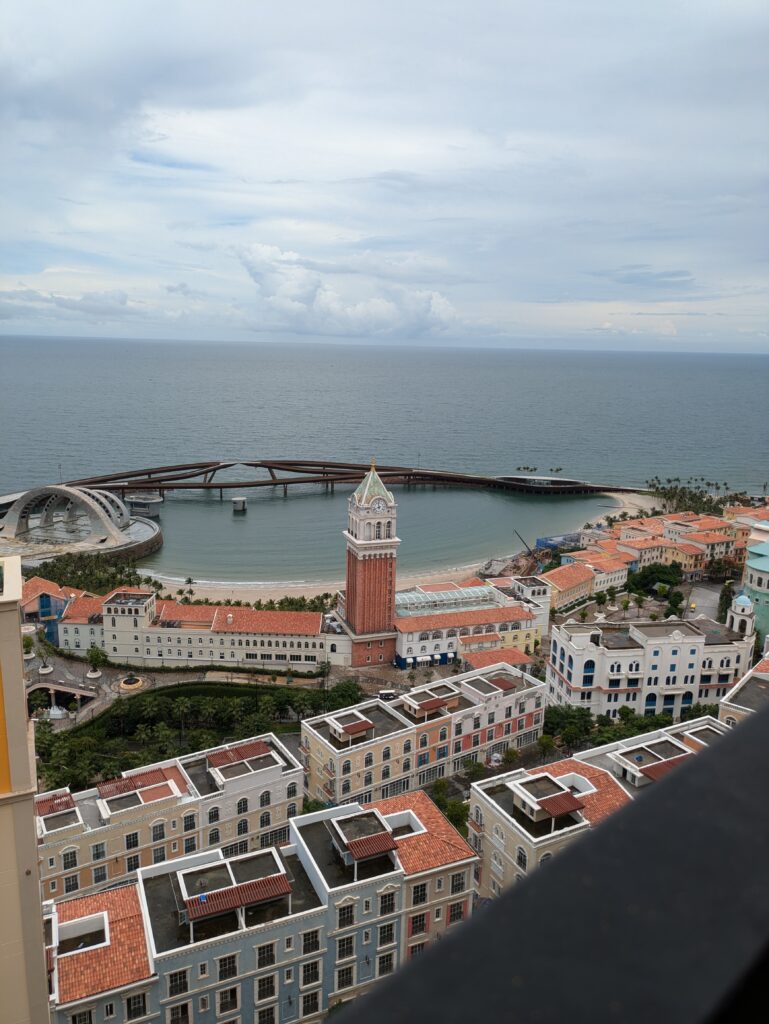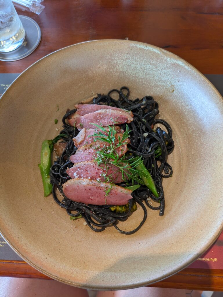 This is whole town is surreal. It has a ritzy feel with all the Italian-style architecture: statues, columns, and accents of faux marble and gold gilding. But it is kind of eerily quiet and seemingly vacant of, well… people. We thought of “build and they will come” motto. There are many places for shops that are mostly empty. We work our way down, as the town is set up on a hill, toward the ocean front. It is hot and humid, but the rain has stopped. We go down stairs and escalators that are outside – and each landing area that we arrive at has a posh set-up…. a statue setting; a pool/ fountain area; or alcove of a small garden. It is so seemingly grand, but yet fake feeling. It is hard to describe. Anyway, we arrive at a restaurant, RuNam Phu Quoc. We went after looking at their menu. We ordered Squid Ink Linguine with Smoked Duck Breast, and Spaghetti with Shitake Mushrooms and Crispy Pork Belly and just water to drink. It was good, but it was expensive… as in 660,000! … well, that’s Vietnamese Dong!🤭🤣😂 This equals $26, which is still expensive for lunch. The water was in a glass bottle and imported from Italy, which cost $7 by itself! When our food arrived, it was portioned way too small. We finished and knew we would be hungry soon. So… we will be eating mostly outside of touristy Sunset Town.