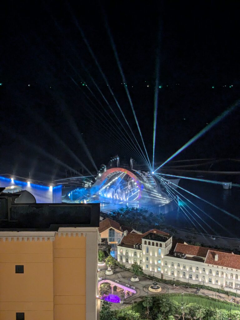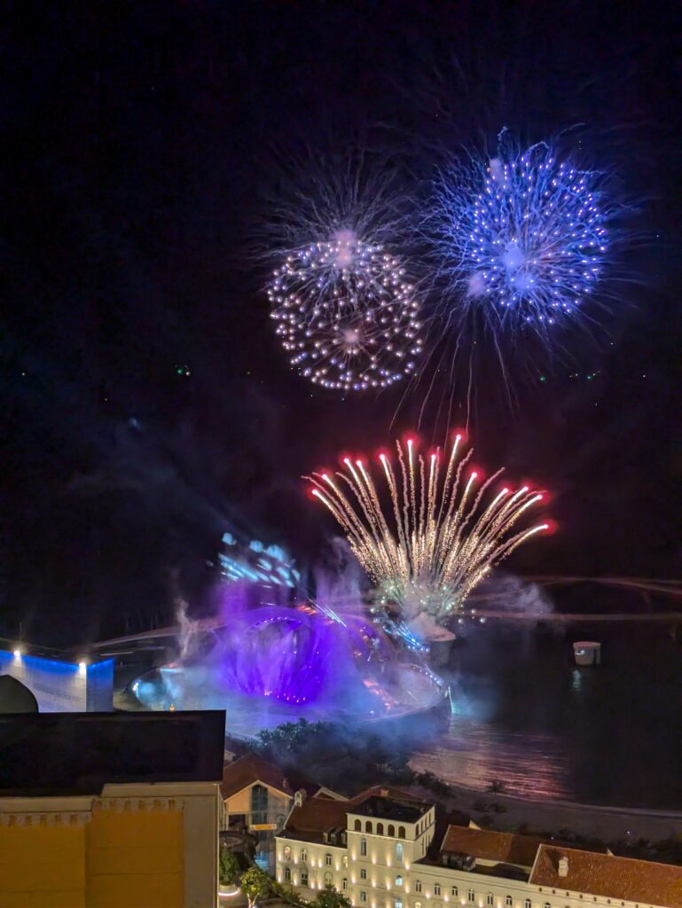Then at 2100, we went out on the balcony for a show… Sunset Town puts on a firework show every night, except Tuesdays. At the beach, a lagoon type enclosure was built for this touristy town. There is a Kissing Bridge and the show stage for the nightly- light, sound and following firework display. The whole production was in English and lasted 35 minutes. It was pretty cool! We will get to experience this six nights a week. Don’t know if the show is the same each night, but I can’t wait to find out. Either way, I love fireworks and that will make it worth it!