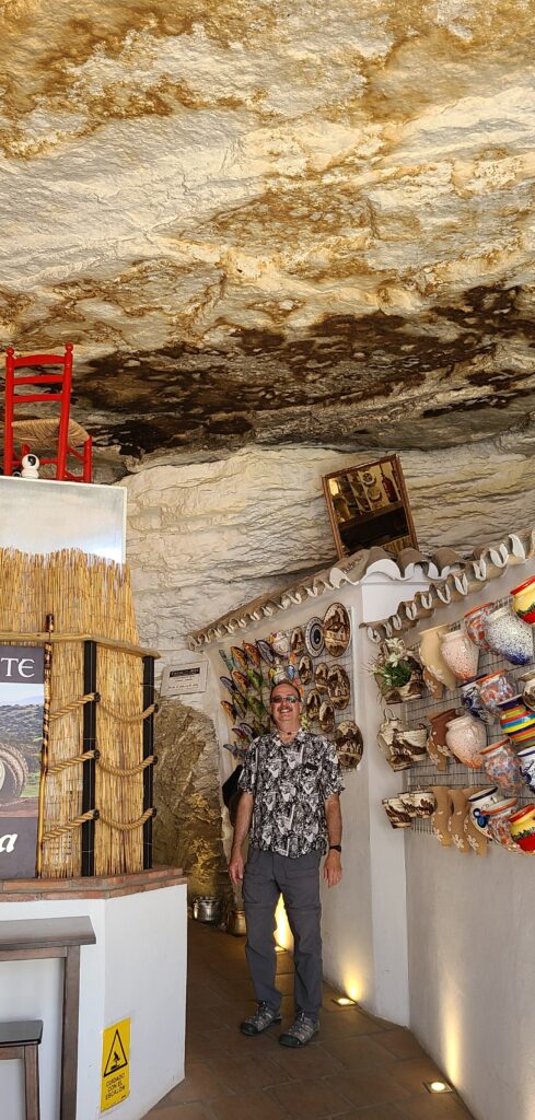 Back at hotel, we had breakfast and checked out. Jeff drove along small roads to, Setenil de las Bodegas. This town is known for whitewashed houses built into the surrounding cliffs. We went into one place that was a shop. You could see the rock ceiling. It was very cool inside the shop due to rock surface, really quite nice! We bought a chocolate bar. Meandered about a bit and then back in car.