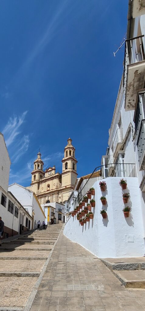 From here we went to Olvera. Another mountaintop whitewashed town, but this has sweeping views from an Arab castle and Nuestra Senora de la Encarnacion church, that both sit prominently over the town. The street up to these attractions is a very steep, narrow drive. We parked and bought entry into the ruins of the castle. It was a hike and ‘clamoring’ up some steps, but well worth the wind-swept views. You could see enemy movement for miles. (I must say it was quite scary for me though!!) When we came back down the church was closed for siesta time – so we missed seeing inside. We did a picnic lunch of bananas, plums, nuts, and chocolate, of course, along a shaded promenade with view up of the castle/church.